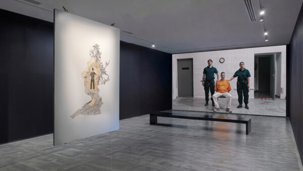 In the Val-de-Marne contemporary art museum, white safety strips delimit an apparently empty space on the floor. At its edge, the museum’s signage: ‘please do not touch’. In the monitor of one of the signage benches by designer Ruedi Baur installed by the museum to explain and complete the works: a video recounts the arrival and assembly of an invisible monumental sculpture.